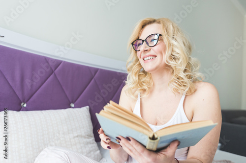 Attractive blonde woman in glasses with black rim sits on the edge of the bed at home with a book and reads