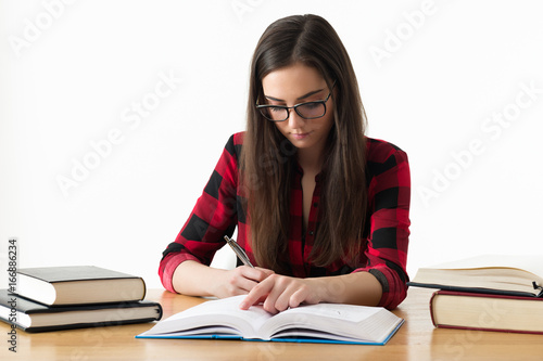 Attractive caucasian girl studying for her exams at home, education concept on white background