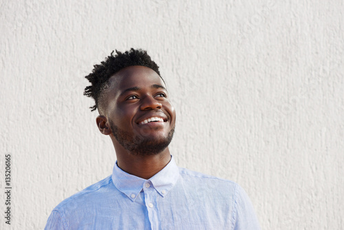 attractive man laughing and standing by wall