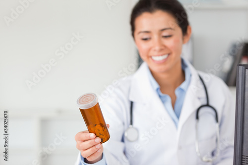 Attractive smiling doctor holding and looking at a box of pills