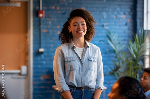 Attractive woman smiling standing front her colleagues wall background Smiling Woman Concept