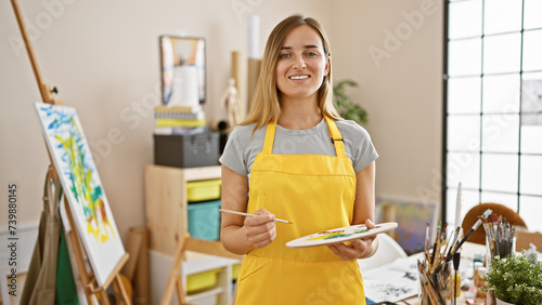Attractive young blonde woman artist confidently smiling, holding a paintbrush and palette in the lively art studio environment