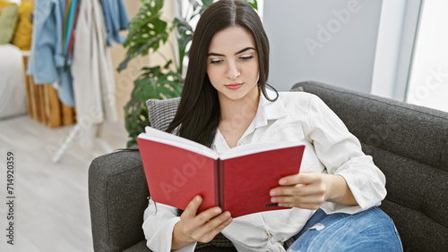 Attractive young hispanic woman reading in her cozy apartment living room.