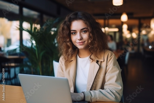 Attractive young lady immersed in her work on a laptop, a female freelancer or student engrossed with her computer at a cafe table, confidently gazing into the camera