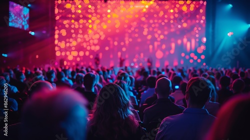 Audience enjoying a live concert on stage with vibrant lighting and large screen.