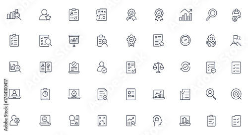 Audit and assessment icons set, vector illustration with editable stroke, analysis, evaluation, planning, quality review, inspection, performance, goal setting, measurement, and business strategy