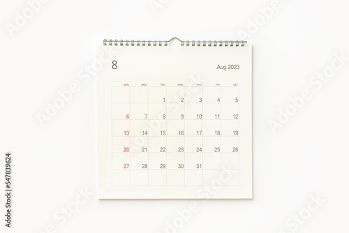 August 2023 calendar page on white. Calendar background for reminder, business planning, appointment meeting and event.