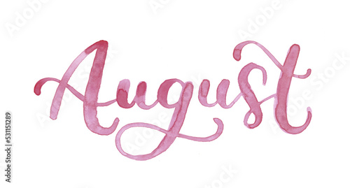 August month of the year in watercolor and brush letters. A beautiful lettering design of the word January to use in a calendar, diary, bullet journal, annual report or planner.