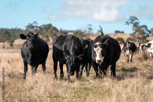 australian beef cattle grass fed, Cows in a field eating grass and long green pasture crop with a herd of cattle in Australia