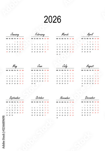 Australian calendar 2026 in english language with australian holidays. Week start on Monday. Vector graphic.