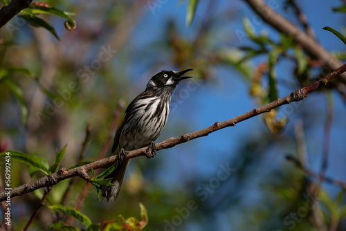Australian New Holland Honey Eater bird perched on a branch mid song.