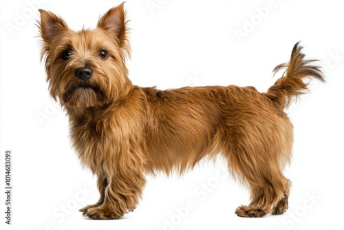 Australian Terrier stands confidently, highlighting its distinct wiry coat and sturdy build