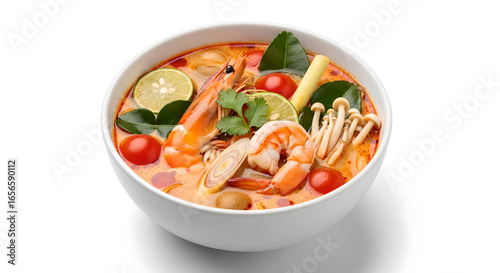 Authentic Spicy Tom Yum Goong Soup with Fresh Prawns and Herbs on White Background