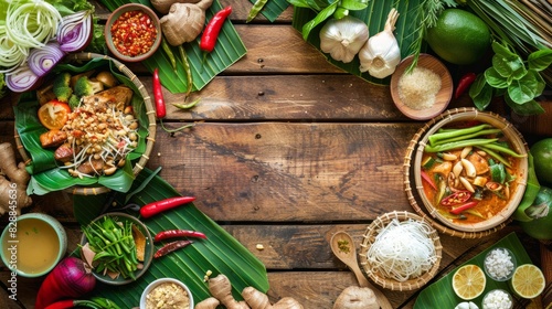 authentic thai food and ingredients on rustic wooden background including fresh herbs, spices, and traditional thai cuisine elements