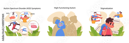 Autism challenges and perspectives set. Highlights ASD symptoms, high-functioning autism complexities, and societal stigmatization. Promotes awareness and empathy. Flat vector illustration