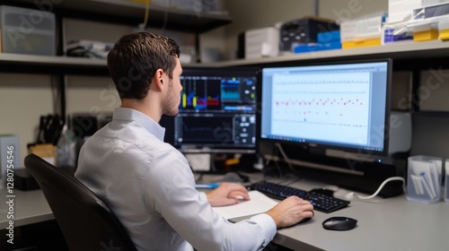 Autism research in a neuroscience lab, a scientist reviewing behavioral data on a screen. Featuring clarity and analysis