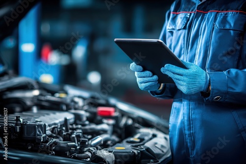 Auto mechanic in blue uniform using digital tablet to inspect car engine
