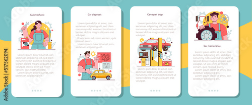 Auto mechanic mobile application banner set. Mechanic in uniform check