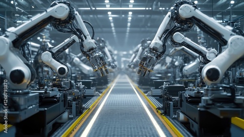 Automated Assembly Line: Robots and Conveyor Belt in Modern Factory