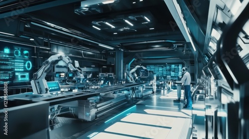 Automated Factory Floor with Robotic Arms and Human Technician Overseeing Operations