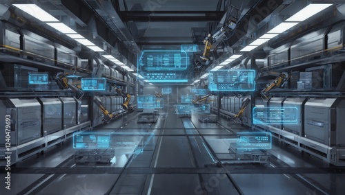 Automated factory, robotic arms, futuristic production line, data displays, industrial technology