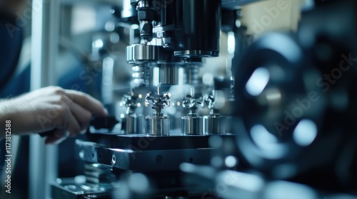 Automated industrial machine is operating on small metal parts in a modern factory, showcasing advanced manufacturing technology and automation processes