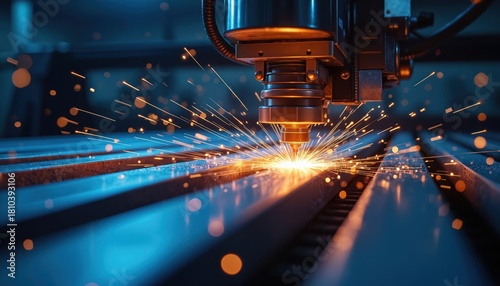 Automated laser cuts metal emitting bright sparks. Modern machinery performs precise industrial manufacturing. Intense blue light illuminates glowing metalwork in a factory.
