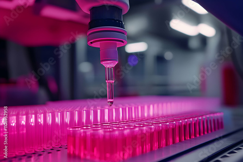 Automated Liquid Handling, Robotic Arm Dispensing Pink Reagent into Microtubes in a Laboratory Setting