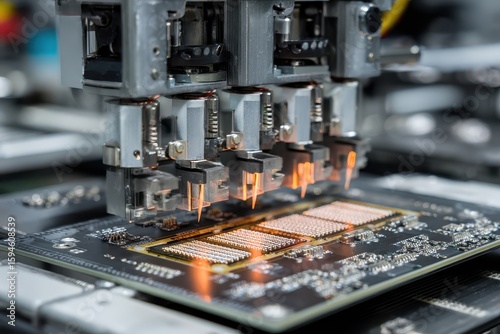 Automated machine soldering a circuit board in a close-up shot. Ideal for illustrating hi-tech manufacturing, engineering, or robotics.
