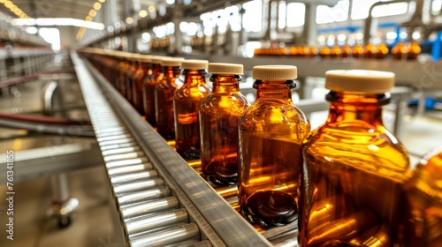 Automated pharmaceutical production line with glass bottles on conveyor in manufacturing facility