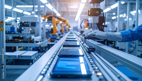 Automated production line assembling electronic devices with robotic arms in modern factory