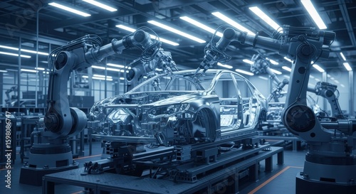 Automated robotic arms assembling car bodies in a cutting edge factory highlight the integration of advanced automation and innovative manufacturing processes within the automotive industry