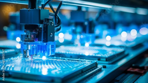 Automated soldering machine on pcb with electronic components in tech manufacturing