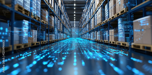 Automated warehouse with digital data streams and networked pallets for streamlined logistics and supply chain management.