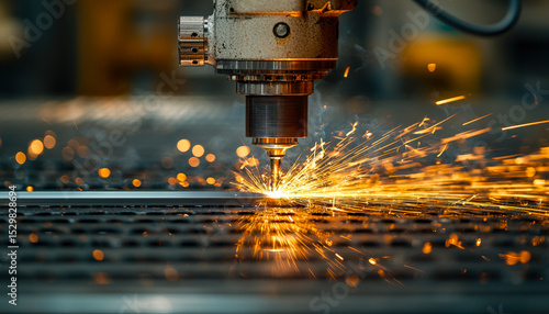 Automatic laser welding machine cutting metal with sparks flying in a manufacturing factory