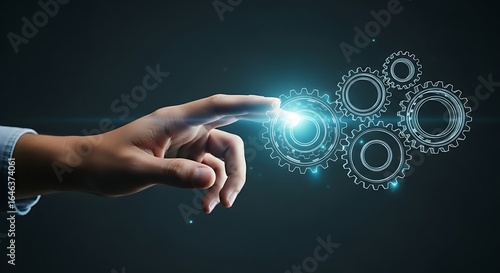 Automation and process concept. A hand touches a set of interlocking holographic gears, which start to rotate in sync, symbolizing automation.
