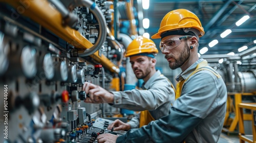 Automation engineers examining a control panel connected to robotic machinery in a cutting-edge factory.