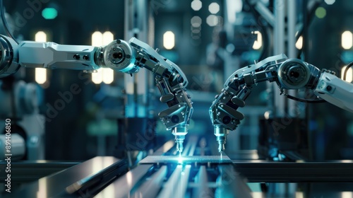 automation robot arms machine in intelligent factory industrial on real time monitoring system software. Welding robotics and digital manufacturing operations.