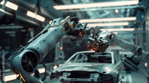 Automotive assembly car industry 4.0 factory with advanced IoT automated autonomous robot arms technology on 5G system. Industrial revolution background.