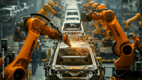 automotive assembly line, where a series of orange industrial robots are intricately assembling a car with precision