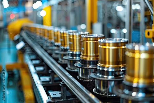 Automotive manufacturing line displaying engine pistons on a conveyor belt
