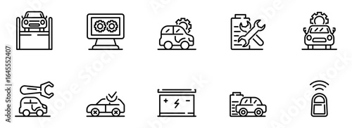 Automotive Repair Service Icons: Modern Line Art Graphics for Website, App, or Marketing Materials; Clean, Minimalist Style; Professional and Efficient Mood.