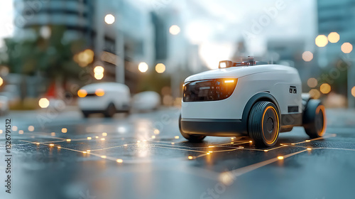 Autonomous delivery robot navigating urban streets cityscape technology showcase evening setting close-up view innovative logistics solutions