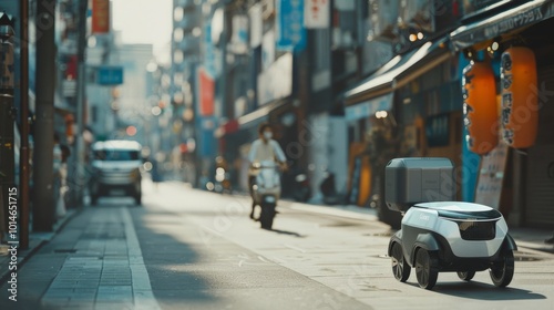 Autonomous delivery robot steadily traverses a vibrant street, embodying the intersection of technology and city living.