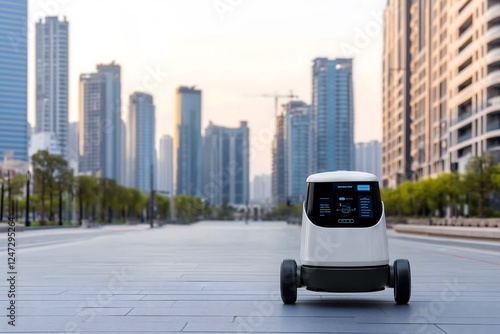 Autonomous delivery robot with digital interface navigating an urban street surrounded by modern skyscrapers at sunset, perfect for showcasing innovation, smart logistics, or futuristic transportation