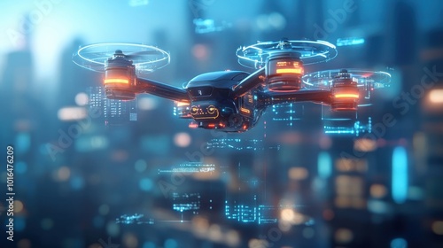 Autonomous drone fleet scanning a futuristic urban landscape, digital logistics innovation,