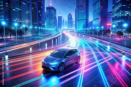 Autonomous vehicle technology and smart mobility concept with a car and dynamic light trails on a digital city road showcasing futuristic transportation and connectivity Neon Color