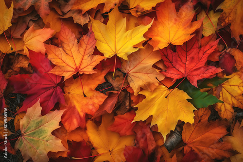 autumn background with fallen orange golden maple leaves with a copy space. Generative AI illustration