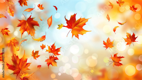 Autumn background with falling leaves blowing in the wind against a blurry background