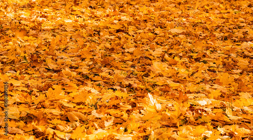 Autumn background with golden maple leaves covering the ground. Seasonal fall texture. Selective focus.